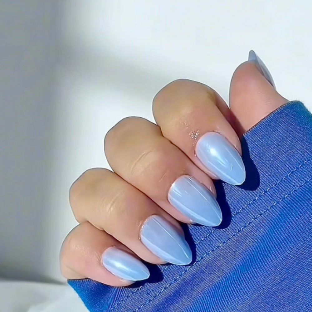 Meet “Blue Glazed” 🌙 These almond-shaped nails shimmer in a soft, iridescent blue, reminiscent of the gentle glow of moonlight. The subtle sheen adds a touch of elegance, making them perfect for any occasion where you want to radiate calm and sophistication. ✨