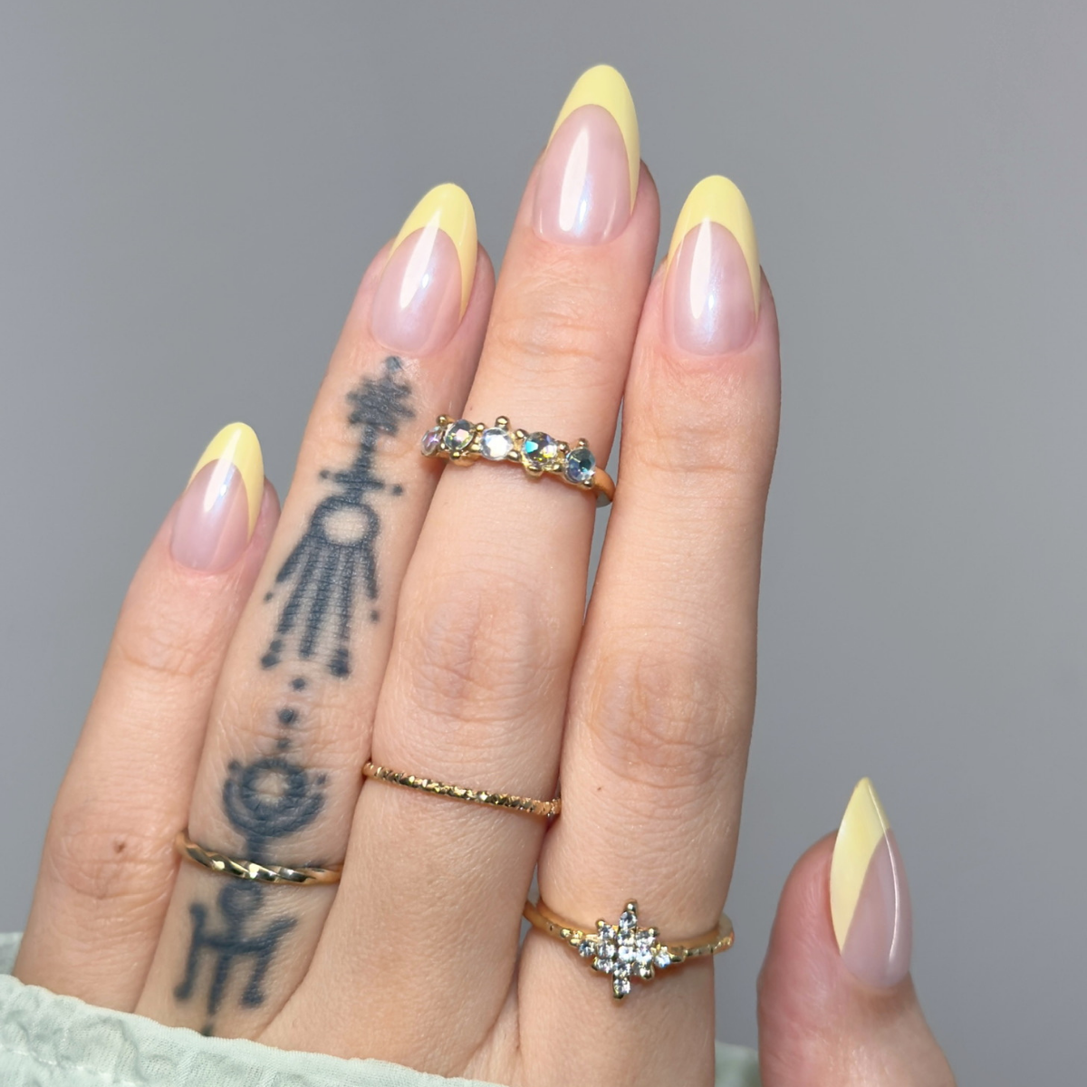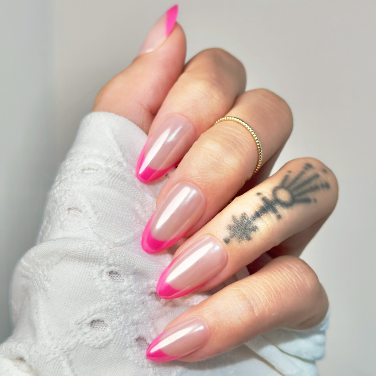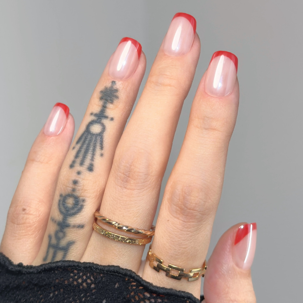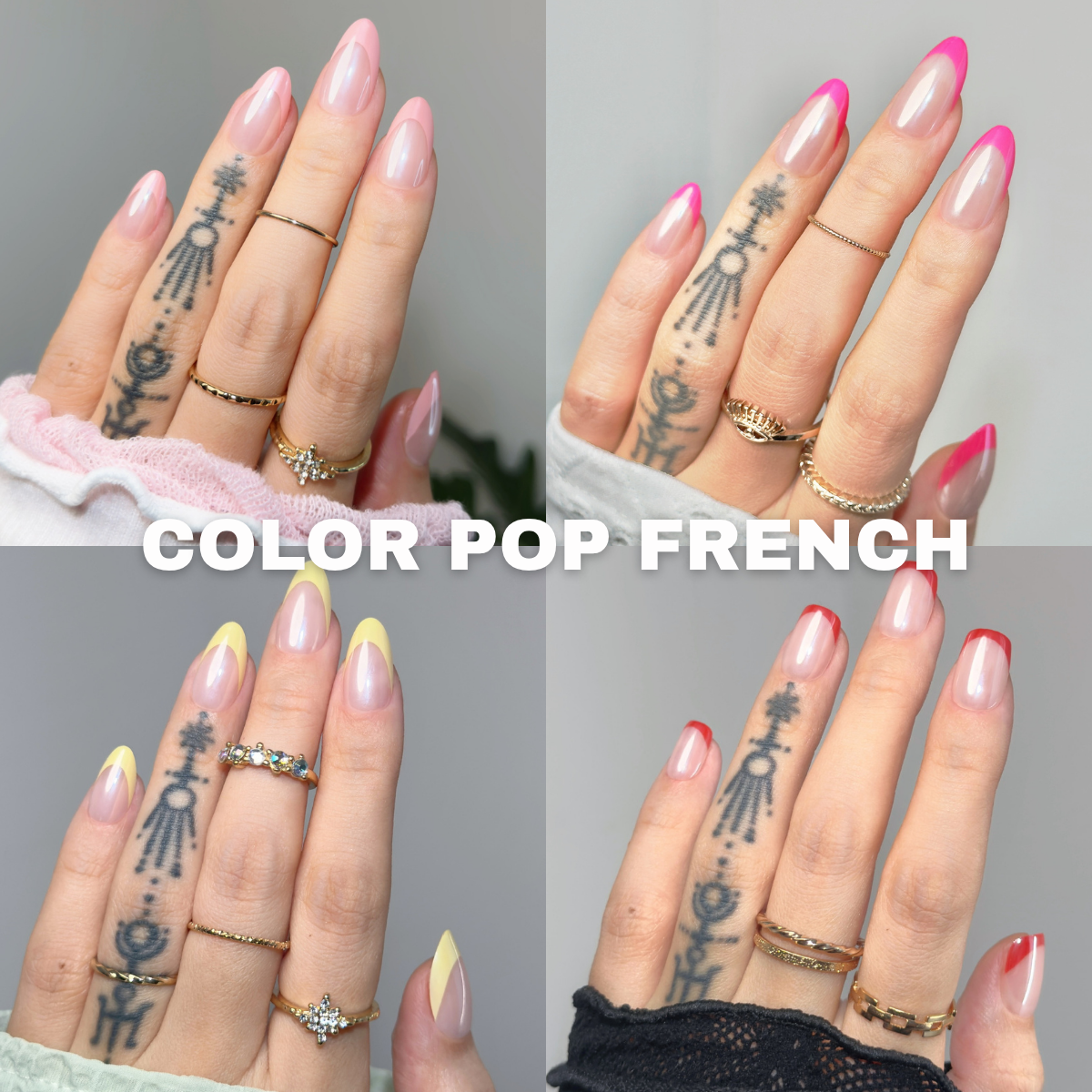 A playful remix of the classic French tip—featuring bold pops of color in pink, red, yellow, and white. Clean, chic, and full of personality.