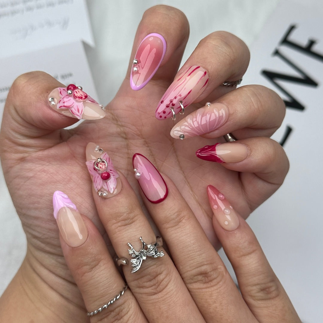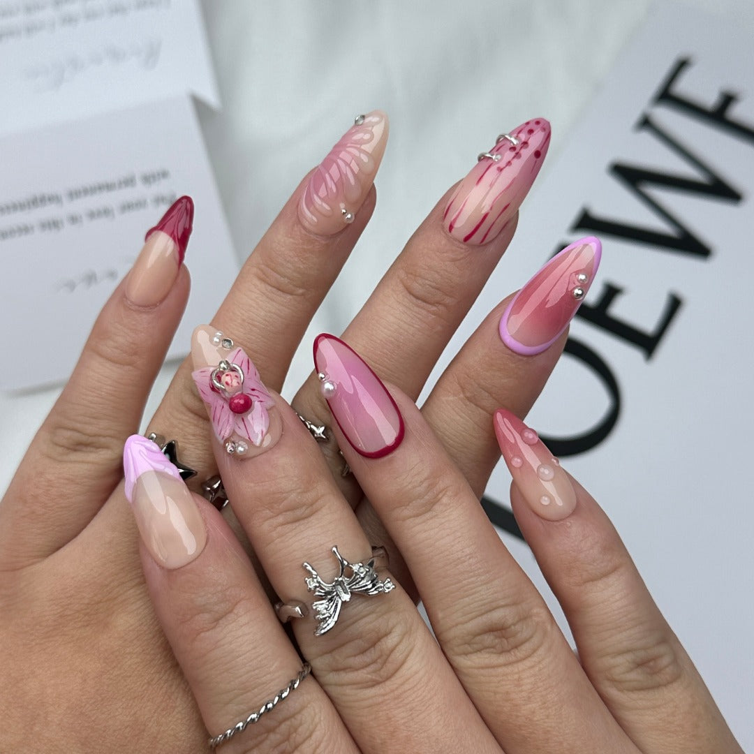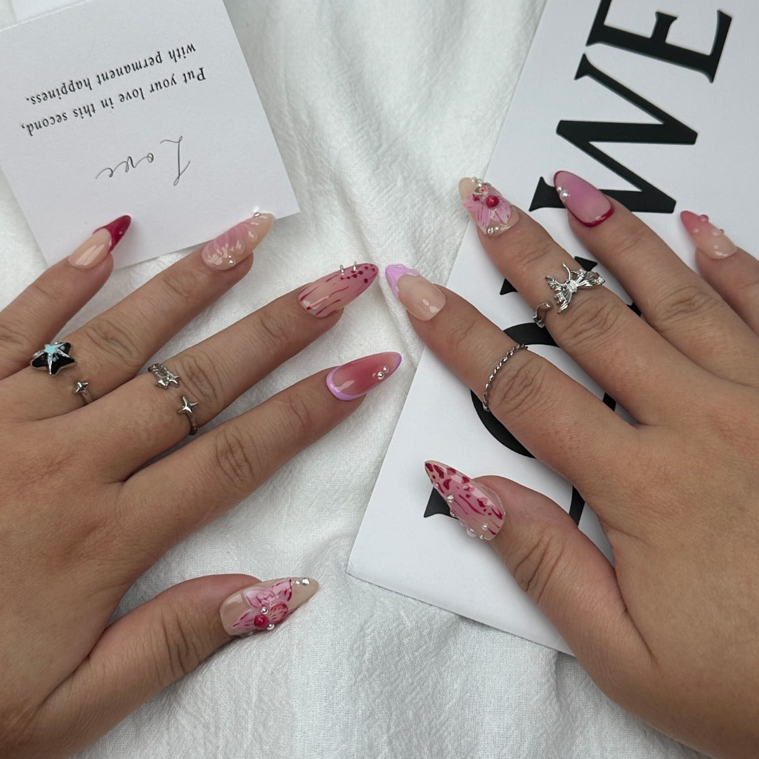 Each set has 10 pcs of Press-on nails and a Free application kit(Nail glue, Sticky tab, Nail file, and cuticle pusher). Within minutes- you'll have nails fit for a Queen!