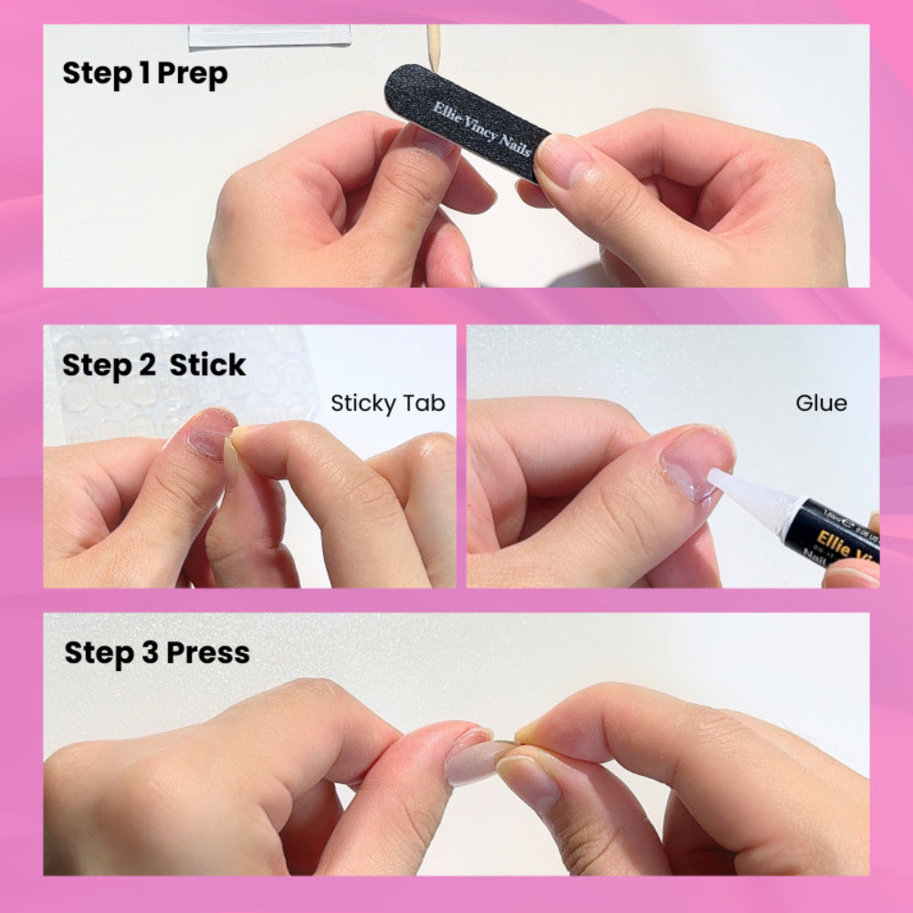 Tous les kits comprennent un tampon d'alcool, une lime à ongles, un bâton à cuticules, des languettes autocollantes et de la colle.