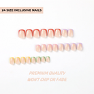 Das Tolle an unseren Nägeln ist, dass sie in vielen verschiedenen Größen erhältlich sind. Unsere Sets mit 24 Nägeln enthalten 12 verschiedene Größen und unsere Sets mit 30 Nägeln enthalten 15 verschiedene Größen. Bitte beachten Sie, dass Sie alle Nägel auch so formen können, dass sie perfekt passen. Außerdem kann die Breite unserer Nägel zwischen 6,3 mm und 14,02 mm variieren.